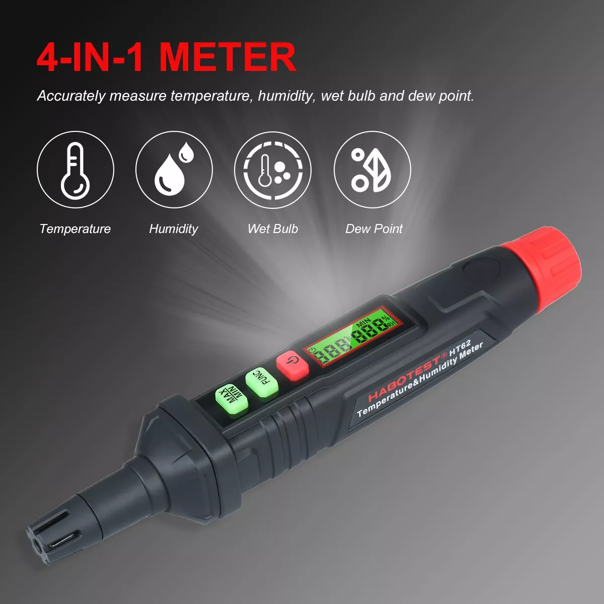 : medidor 4 en 1: mide con precisión la temperatura, la humedad, el bulbo húmedo y el punto de rocío.